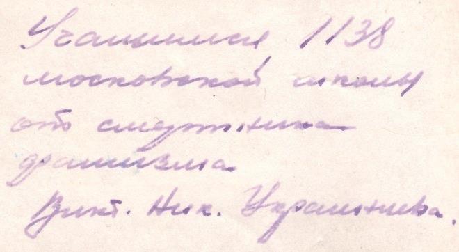 В конверт вложена небольшая фотография (5,5х8 см), о которой упоминает Виктор Николаевич. Надпись на обороте фото: «Учащимся 1138 московской школы от смертника фашизма Викт. Ник. Украинцева».