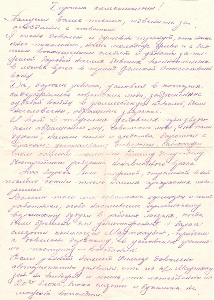 Авторы публикуют уникальный исторический источник – письмо советского офицера Виктора Николаевича Украинцева, участника восстания 1945 года в концлагере Маутхаузен, учащимся московской школы № 1138. Рассмотрен контекст, в котором началась переписка: особая история возникновения и развития советского «города-сада» Институт Пути, обусловившая интерес школьников к героям Великой Отечественной войны и их опыте сохранения мужества и верности Родине в самых тяжёлых обстоятельствах, и создание школьного музея под руководством учителя истории Тамары Александровны Шеленок (до замужества – Поляковой). Авторами подготовлена историческая справка о восстании, о побеге В.Н. Украинцева, об отражении этих событий в советской литературе 1960-х гг. и о московском наукограде – Институте Пути, где располагалась школа, учащиеся которой выступили инициаторами переписки. В приложении размещены фотокопии письма и прилагавшейся к нему фотографии В.Н. Украинцева.