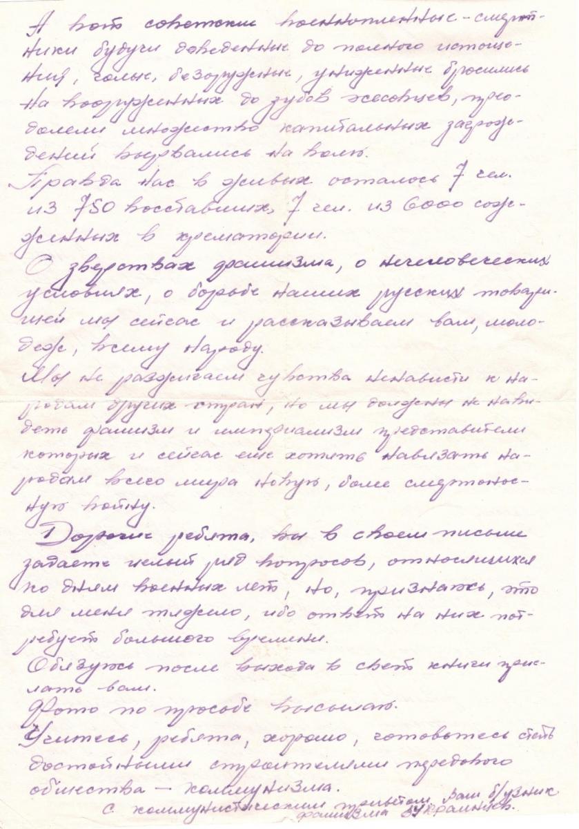 Неизвестно, о будущем выходе какой книги пишет в 1962 г. Виктор Николаевич. Возможно, это книга открывшего многие забытые имена писателя, теле- и радиоведущего, автора «Брестской крепости» С.С. Смирнова. Или же вышедшая только через три года документальная повесть И.Ф. Ходыкина (в конце текста указаны годы работы над книгой: 1962-1964). Отметим, что книги о Маутхаузене выходили и раньше публикуемого письма [2; 13; 15]. Однако нельзя исключить, что В.Н. Украинцев работал над собственными воспоминаниями. Такая книга, насколько известно, не была опубликована.